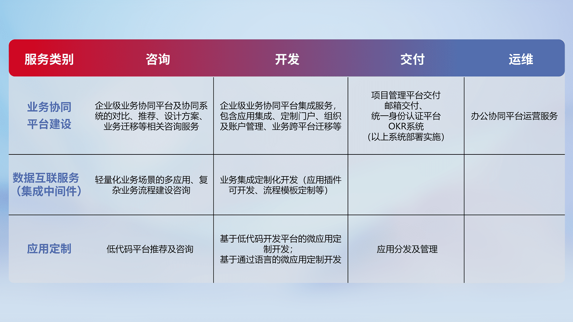 针对钉钉、、、、企微、、IDaas等平台级产品提供产品的规划、、、、方案、、、、交付、、定制化开发等服务,,实现如统一协同办公、、、、智能客户服务、、、、混合会议管理、、、智能数据查询、、、等业务场景,,,,实现数字化转型。。。